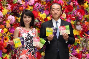 当日は、CMと同じ鮮やかな花柄の衣装で登場した大島優子さんは、CMの世界観を再現した約100種類の花などを彩った巨大「フラワーウォール」を自身の掛け声でお披露目すると「花やフルーツが盛り込まれていて、発色がいいので強い女性のイメージがします」と語りました。ピュレグミのイメージキャラクターに選ばれたことについては、「いつも身近にあった商品。甘さとキュっとするすっぱさが大人を思わせる味です」とピュレグミの印象を語りました。