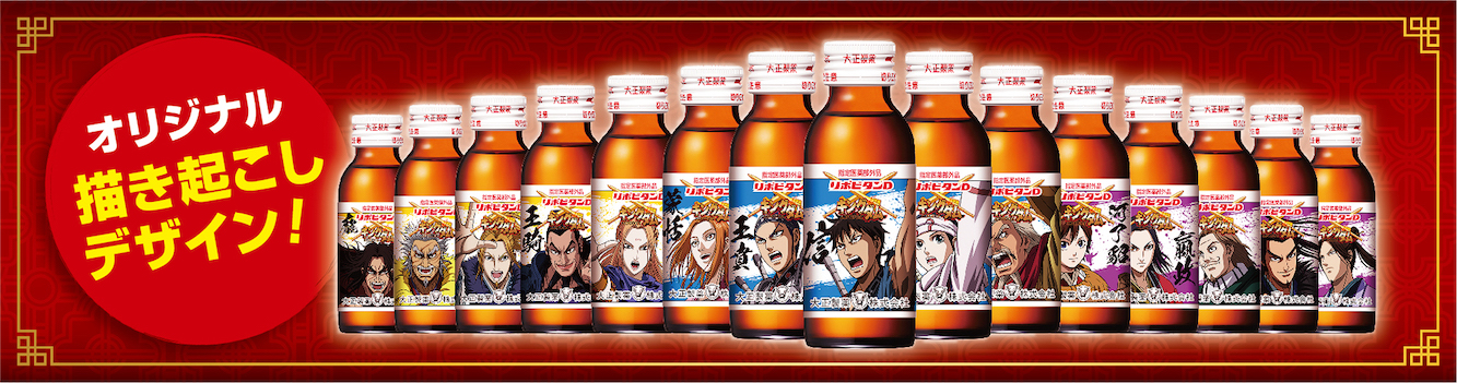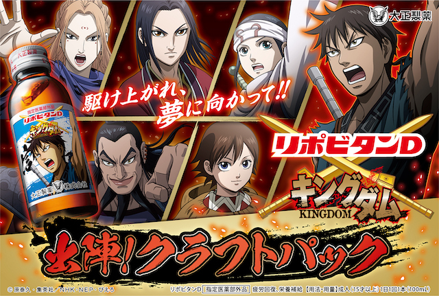 大正製薬株式会社は、リポビタンDとアニメ「キングダム」との限定コラボレーション商品「出陣!クラフトパック」(10本入)全3種を、Amazon等で2019年3月18日(月)より予約を開始し、3月29日(金)〜5月29日(水)の期間限定(※)で販売します。