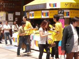 紀伊國屋書店本店(新宿区)では、朝から、全5色のうち“黄色の『ゲドを読む。』”をズラっと並べた専用ブースを設け大々的に配布。新宿の街角を忙しく行き交う通行人も、足を止めて、その『ゲドを読む。』に注目。学生、サラリーマン、OLほか老若男女問わず、 手渡しするスタッフから“無料の文庫本”を興味深く多くの方が受け取られていました。 全国津々浦々で在庫切れ状態となり、特別に多くの部数を確保していた紀伊國屋書店大阪梅田店でも即日在庫切れとなるど、全国的に注目を集めています。