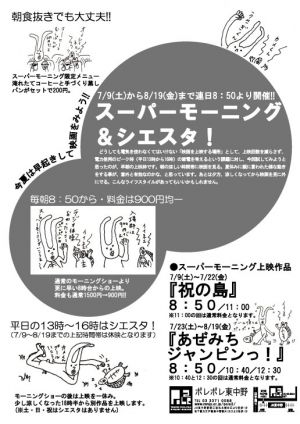上映館のポレポレ東中野では、夏の間、開館時間を早め、平日の日中は上映を行わない<スーパーモーニング&シエスタ!>を行います。