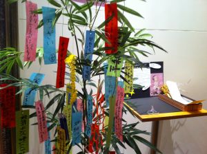 この度は、公開劇場であるヒューマントラストシネマ有楽町のロビーに7月7日の七夕を前に、笹にメッセージの短冊を下げた“祈りの七夕飾り”が展示されました。すでに試写などで本作を見た人の感想や平和へのメッセージ、震災に遭った人々への応援メッセージなど様々な温かいメッセージが色とりどりの短冊につづられています。劇場を訪れる人々も立ち止まり、多くの方々が短冊にペンを走らせて下さっている光景は感動的です。ただいま50文字で皆さんの温かいメッセージを募集中です。いただいたメッセージは短冊に書かせていただき、掲示した後にはヘブライ語に翻訳してイスラエルに帰国したシュロミー・エルダール監督に贈りますので、ぜひメッセージをお寄せいただきたく募集いたします。