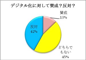 ★アンケートを実施して分かったのは、業界だけで話題になっているデジタル化問題が、一般の映画ファンには浸透していなかったこと。また、地デジやブルーレイの普及で、映像のデジタル化には慣れてきたコアユーザーが多く、年配のファンも映画館のデジタル化にはさほど抵抗の無い方も多かった。さらにリマスターされて、35㎜フィルムよりもきれいな画質の映画などがテレビやブルーレイで見られる環境になっており、ファンにはメリットはそれなりにある。一方、デジタル化のため色の発色が良過ぎてフィルムの質感が損なわれたという意見や、音楽のLPからCD、配信の移行と比較し、時代の流れとしてアナログのフィルムからデジタルデータへの移行は避けられないという考えも多く聞かれた。いずれのファンも望んでいるのは、フィルムセンターに代表される国や映画業界全体が協力して、良質な作品を長くみられるように今後、映画のデジタル素材としてネガなどのフィルム素材をライブラリー化してほしいというところに集約されているように思われた。