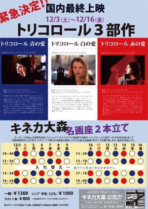 トリコロール三部作「青の愛」「白の愛」「赤の愛」ですが間もなくフィルムの版権切れとなり、日本の映画館での最後の上映となります。