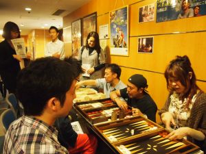 日本でももっと普及させたいという日本バックギャモン協会全面協力のもと、バックギャモンプレーヤー達が上映前と上映後にお客さんにルールの説明書を配布し、実際にボードを使って一から説明し、対戦を行いました。