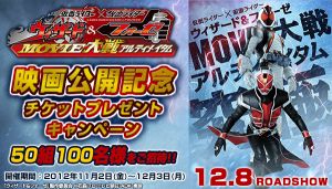 MOVIE大戦シリーズ4作目、『仮面ライダー×仮面ライダー ウィザード&フォーゼ MOVIE大戦アルティメイタム』の公開を記念して、映画鑑賞チケットを50組100名様にプレゼントいたします(http://p-bandai.jp/contents/kamenridermovie/?rt=pr)。