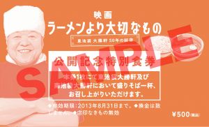 この度、 4月13日(土)より前売鑑賞券が発売開始となります。中でも、東池袋 大勝軒 本店の地元でもあるシネマサンシャイン池袋では “史上初”のラーメン付き鑑賞券の発売が決定! つけ麺の元祖とされ、山岸一雄が考案した“盛りそば”を特別価格500円で食べられるというまたとない機会をご提供いたします。