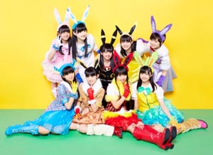 短編「ピカチュウとイーブイ☆フレンズ」は、ピカチュウとイーブイたちの物語。新しく発見されたイーブイの進化形・ニンフィアを中川翔子さん、ナレーションを前田敦子さんが担当することでも話題を集めていますが、さらに今回、エンディングテーマ「手をつなごう」を歌う私立恵比寿中学(エビ中)と、「イーブイ☆フレンズ」とのコラボが決定!エビ中のメンバーがイーブイとその進化形(サンダース、シャワーズ、ブースター、ブラッキー、エーフィ、リーフィア、グレイシア、ニンフィア)に扮し、それぞれのキャラクターをモチーフにした衣装に身を包みました。この「イーブイ☆フレンズ」の衣装を着たエビ中は、TVアニメ「ポケットモンスター ベストウイッシュ シーズン2 デコロラアドベンチャー」のエンディングテーマ「手をつなごう」に5月23日(木)から登場する予定です。曲のラストではアニメ化された姿も披露!(※右図参照)。また、5月26日(日)の「ポケモンスマッシュ!」ではスタジオに登場し、歌を披露します。