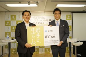 記者発表会では、岩手の方言で「おいでください」という意味の「はまらいん」を冠した「いわて☆はまらいん特使」の就任の証として、達増知事から村上氏に特大名刺を交付しました。