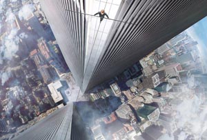 ゆっくりとビル壁面を駆け上っていくカメラ。上にあがっていくにしたがいどんどん加速していくがまだまだ先が見えない。どこまでも続くかと思われた途端、いきなり視点は横から縦へ。突然一人の男が現れ、そこはビルの屋上だと分かる。そう、ここは世界で一番高いビル、ワールド・トレード・センターの屋上だ。男はまるで観光でもするようにNYの景色を眺めながら悠然と歩を進めていく。やがて歩みをとめて見据えた先は、ツインタワーのもう一方の屋上。男は軽く息を吐きながら風を感じる、いや感じるというよりも確かめるというほうがふさわしい。一瞬笑ったのか、はたまた決意したのか意思がつかみにくい表情を浮かべたかと思うと、男は信じられない行動に移った。ビルから飛び出した鉄骨に乗りさらに歩みを進めていくのである。先端まで進んだ男はふと眼下に目を落とす。次の瞬間、ふっと空気が止まる。そこにはいまだかつて経験したことのない光景が目に飛び込み、見る者の脳髄に電流を走らせる。