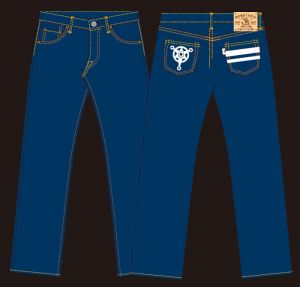 右バックポケットに桃太郎オリジナルステッチ・左バックポケットに八つ裂き光輪を同色で施しています。