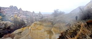 カッパドキアのその世にも珍しい景観は、数億年前に起きたエルジエス山とハサン山の連続した大噴火によって造られたもの。岩部が風雨に打たれて浸食がすすみ、今では固い部分だけが残され、“妖精の煙突”とも言われる摩訶不思議な奇岩群を形成したそうです。