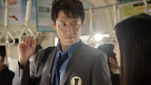 松岡さんが「俺のこと見てます!?」と勘違いし、菜々緒さんが「隣の人、なんでこんな汗かいてんの?」と汗臭いスーツと顔を交互に見ながら、二人の目が合う場面での撮影シーン。それぞれの台詞は心の声ということで、しばらく松岡さんと菜々緒さんが見つめ合うこととなり、あまりにも長い沈黙と照れくさい状況に耐えられなくなった松岡さんが、突然「ある〜日♪」と、童謡『森のくまさん』を歌い出しました。それを受けて、「森のなか♪」と歌をつないだ菜々緒さん。監督のカットの声がかかると、慌てて「僕の暴走に付き合っていただいてすみません」と声をかける松岡さんに、菜々緒さんは「大丈夫です。楽しかったです!」と人懐っこい笑顔で応える一幕もあり、現場は終始穏やかな空気に包まれました。