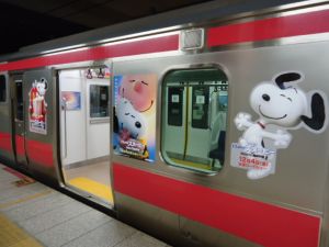 本作の公開を記念して、我らがスヌーピーがJR京葉線をジャック!『I LOVE スヌーピー THE PEANUTS MOVIE』の愛くるしい広告デザインが施された京葉線が、本日から東京〜蘇我間を駆け巡ります。車体は1号車から10号車までを大胆にラッピングし、バラエティに富んだスヌーピーのビジュアルでいっぱいに。ドアの横には、3DCGで毛並までリアルに表現された、“もふもふ”のスヌーピーが印象的な映画ポスターがあしらわれています。ドアが閉じるたびに現れる、思わず抱きしめたくなるほどキュートなスヌーピーは必見!車体にはほかにも、実は空想好きなスヌーピーが勇敢なパイロットになりきったキャラクター「フライング・エース」の姿が。映画ではこの「フライング・エース」となったスヌーピーが、パリの上空でダイナミックな飛行アクションとアドベンチャーを繰り広げます。実際に劇中ではどんな活躍を見せてくれるのか、車体を見ながらスヌーピーのように“空想”してみるのも楽しそう!そのほか、ポップコーンを持ってはしゃぐスヌーピーや、映画公開日がクリスマスシーズンであることからサンタクロースの帽子をかぶったスヌーピーなど、さまざまな恰好のスヌーピーが大集合!走行中に遭遇したら自然と笑顔になるような、キュートな車体ラッピングに仕上がっています。