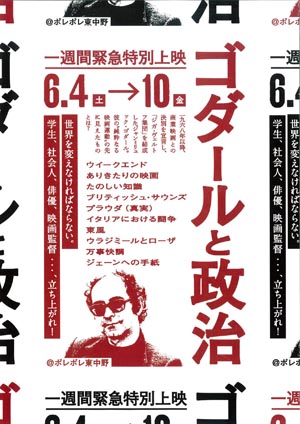 原発問題、憲法改正、安保法制…誰もが「政治的」にならざるを得ないニッポンの現在。私たちは自らを取り巻く「政治」をどのよう考え、対応すればよいのか?この上映は、およそ半世紀前にゴダールらが実践し制作した諸作品に触れ、そのユニークな映像と音を経験しながら私たちの意識や行動への触発になることを期待し、企図されました。そして、「ヌーヴェル・ヴァーグ」の鬼才として、孤高の現代映画作家としてイメージが強くシネフィルとよばれる熱心な映画ファンたちの支持を受けるゴダール作品を、別の角度から再発見する試みでもあります。