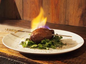 見よ!このインパクト!燃えてる、燃えてる!魔女との戦いに欠かせない武器といえば炎の剣!コールダーもこの 剣で魔女の心臓を狙います。今回出されたメニューは、まさに、魔女 の心臓を刺し貫いた【 魔女の心臓串刺し 】でございます!炎の剣を使ってかぶりつこうかとも思いましたが、コールダーにし か出来ない芸当なので断念。実際の魔女の心臓はかなり高価だそうで (?)豚の心臓(ハツ)を使用しているみたいです!火が収まりいざ試食!うん、旨い!見た目のボリューム通り、食べ 応えもかなりのもの!!皆さん「本物の魔女の心臓を食べたい!」と お思いでしょうが豚の心臓も美味しいですよ!魔女メシのメイン料理 におススメです!!