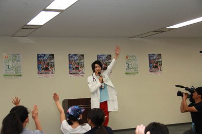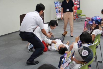 みなさん、救急医療における心臓マッサージ覚えましたか?(子どもたち「はぁーい!」)
