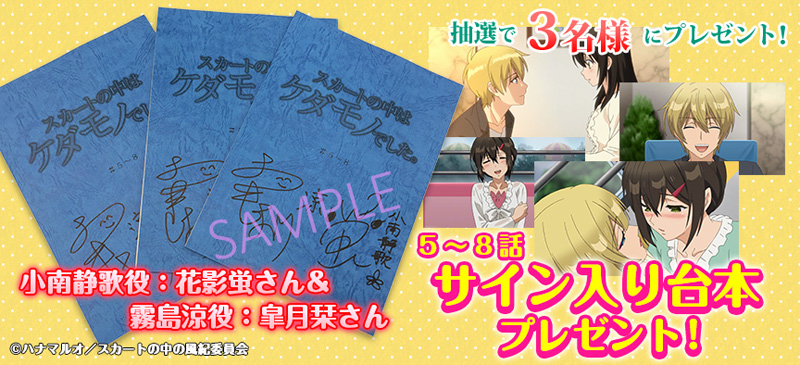 (@sukakeda_anime)にて、プレゼントキャンペーン第2弾を開始しました。メインキャラクターを演じる小南静歌役・花影蛍さんと、霧島涼役・皐月栞さんのサイン入りの貴重なアフレコ台本(第5話~8話分)が抽選でプレゼントされます。